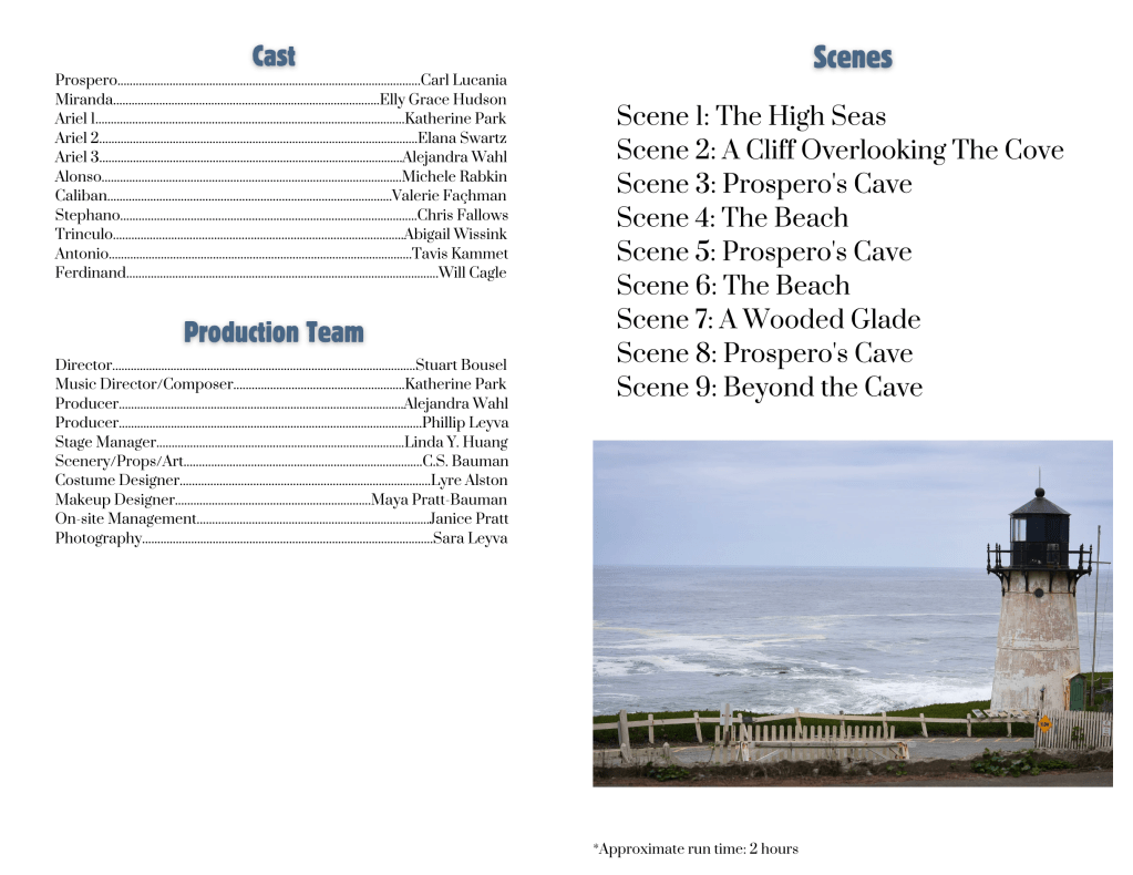 I got to know Christopher Bauman and Janice Pratt through our mutual employer but also my many stays and the times I’d volunteer for the annual Halloween festival. We began to kick around the idea of doing a show in and around the fog signal building probably as early as 2008, and that show was always The Tempest. It just made sense in this environment the way that doing a production of A Midsummer Night’s Dream in the woods or Henry IV in a bar made sense (and I’ve done both). What made it take so long to happen was the timing never seeming to be right, the reasons to do The Tempest never seeming to make sense, perfect location or otherwise. I’m still not sure we picked the right season, or scheduled enough rehearsals, but if you’re reading this then here we are, and if the production is a little rough, well so was the world from which The Tempest sprung over 400 years ago, and so is the one in which it currently seems to be experiencing a bit of a zeitgeist.